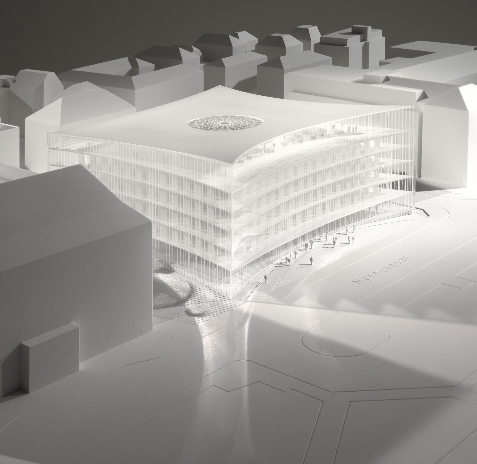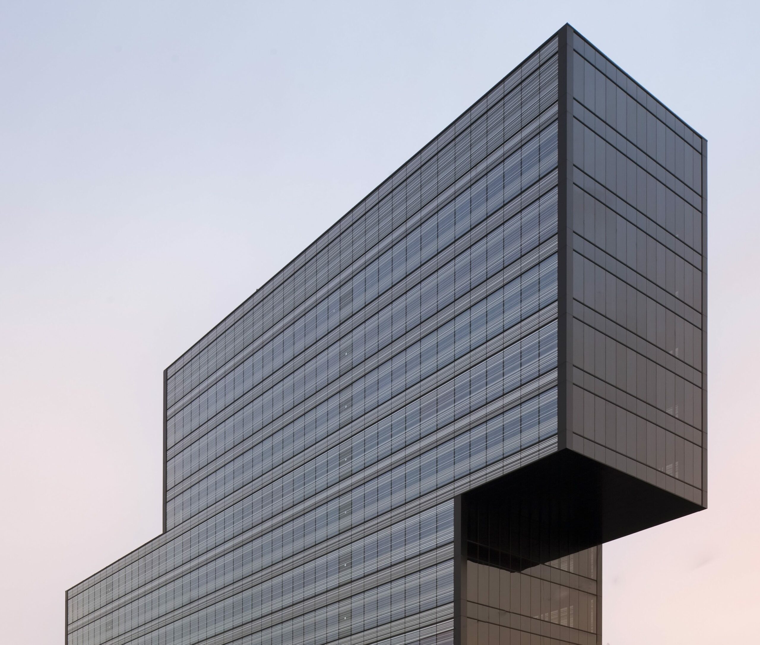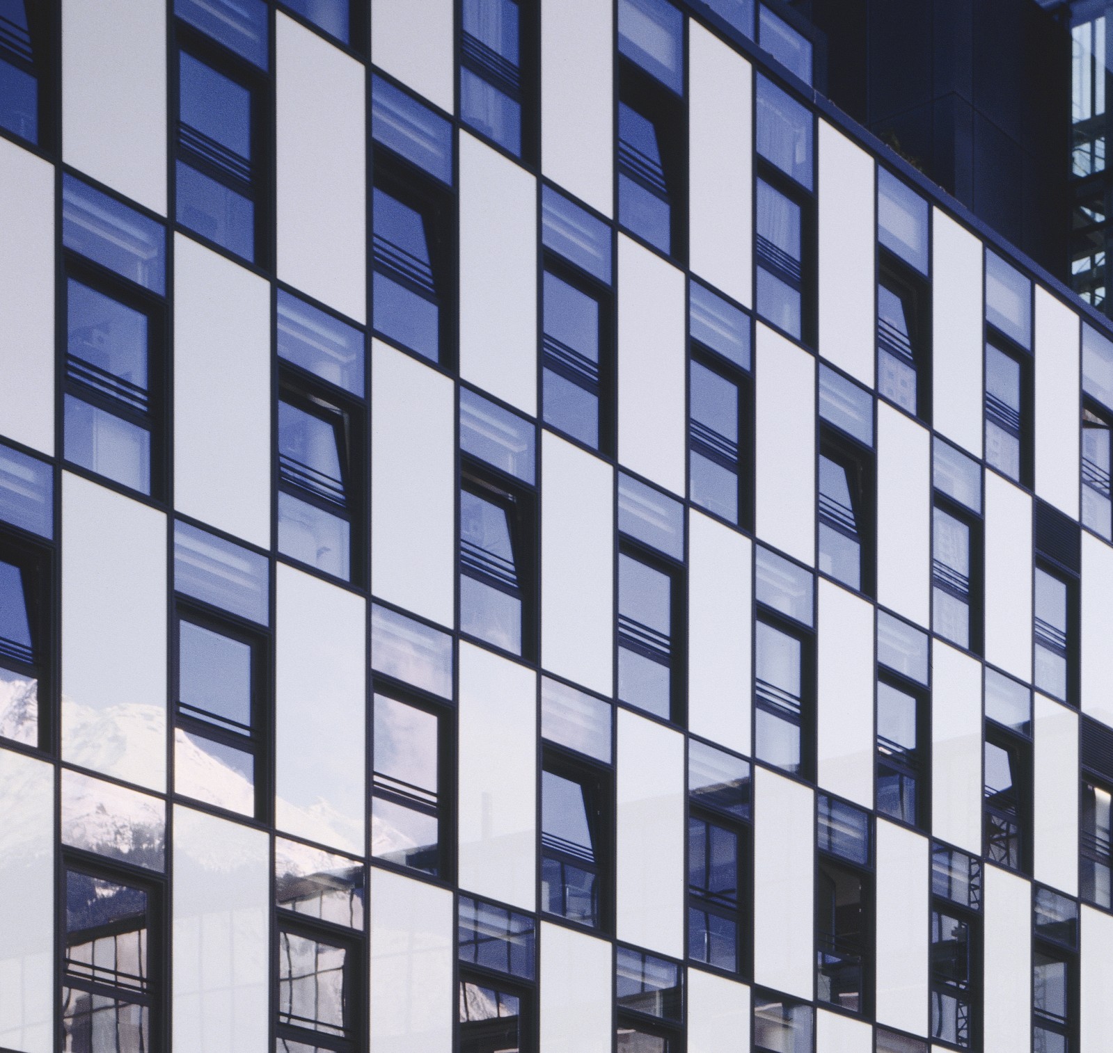 Un vaisseau métallique au pied des montagnes, dont les fenêtres rectangulaires offrent un mur de réverbération au paysage. Ici siège Roche Diagnostics, professionnel du laboratoire et des images éponymes.